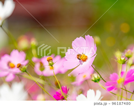 秋の景色 可憐でかわいいカラフルなコスモスの蜜を吸うミツバチ