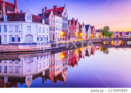 Bruges, Belgium, Flanders. Beuatiful Spiegelrei Canal, famous in Brugge city, sunrise colors.