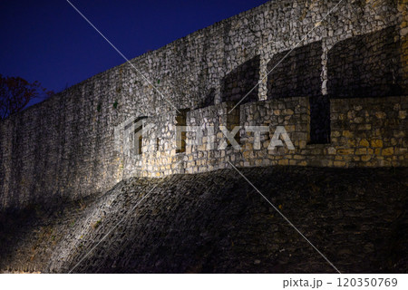 Remains of Historic Belgrade Fortress fortifications in Kalemegdan park at night in Belgrade, Serbia