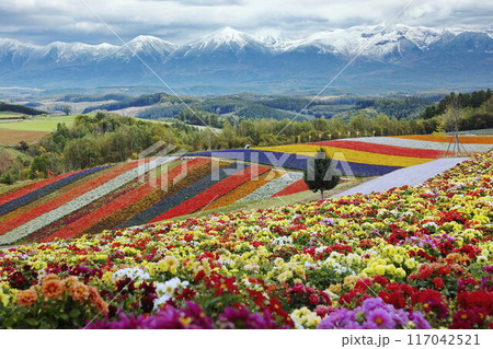 【秋の北海道】 十勝岳の冠雪と四季彩の丘の花風景