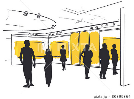 People looking modern paintings at contemporary art gallery