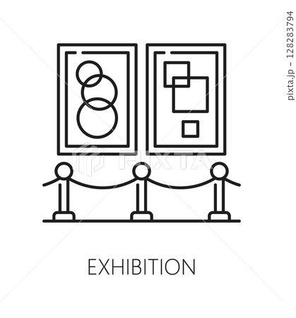 Fine art gallery museum exhibition line icon or sign. Contemporary art exhibition outline vector symbol, painting gallery thin line icon. Museum line pictogram or sign with abstractionism drawings