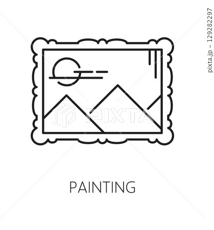 Fine art museum exhibition line icon or symbol. Ancient painting museum thin line vector sign, exhibition lineart symbol. Exhibit pictogram or icon with mountain landscape painting in frame