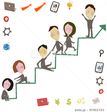 ある目標に向かって助け合いながら、階段をステップアップしていく六人の会社員のイラスト
