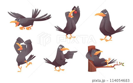 Crows. Black birds flying and standing exact vector funny birds in action poses