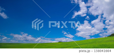 エコロジーと未来をイメージした広大な緑の草原と白い雲の風景