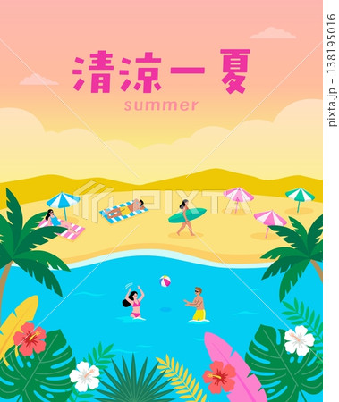 Flat vector illustration of people enjoying a sunny tropical beach vacation with palm trees and flowers