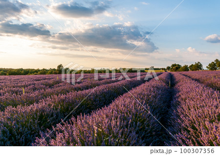 Blooming lavender in a field in Provence. Fantastic summer mood, floral sunset landscape of meadow lavender flowers. Peaceful bright and relaxing nature scenery.