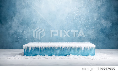 Winter product display platform with hanging icicles on snowy ground, showcasing holiday items or cold weather merchandise in seasonal context