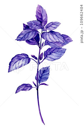 Basil isolated on white background. Branch of purple basil. Culinary herb, fragrant spice. Botanical watercolor illustration.
