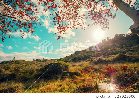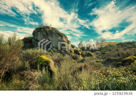 Rocky landscape with many big stones and boulders on a sunny day. Belmonte, Portugal