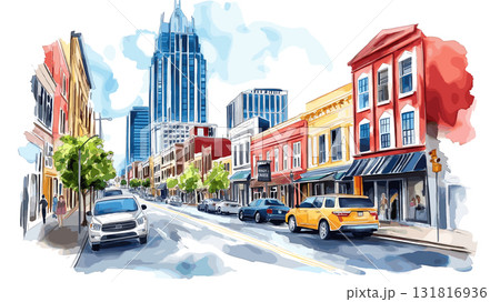 Nashville's Broadway and Music Row. Nashville's Broadway and Music Row hand drawn watercolor illustration