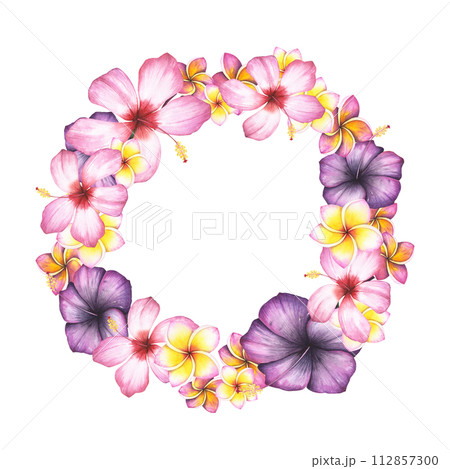 Wreath frame pink hibiscus and plumeria flower isolated on white background. Watercolor hand drawn frangipani botanical illustration. Art for design banner, poster, cosmetic, relaxation, template