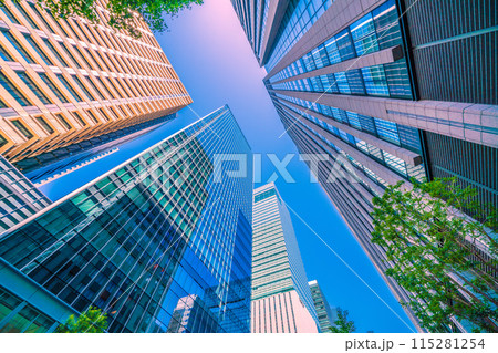 日本の東京都市景観 新緑。大手町の摩天楼など望む。右は大手町パークビルディング、左は大手町ワン=5月