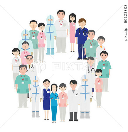 病院前にいるたくさんの医療従事者たち2(背景有り)