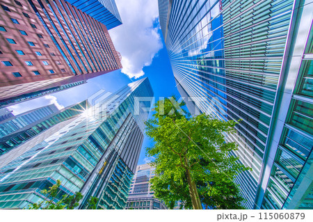 日本の東京都市景観 大手町交差点前の大手町駅や青空と新緑に映える摩天楼=4月