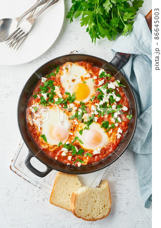 Shakshouka, eggs poached in sauce of tomatoes, olive oil. Mediterranean cousine.