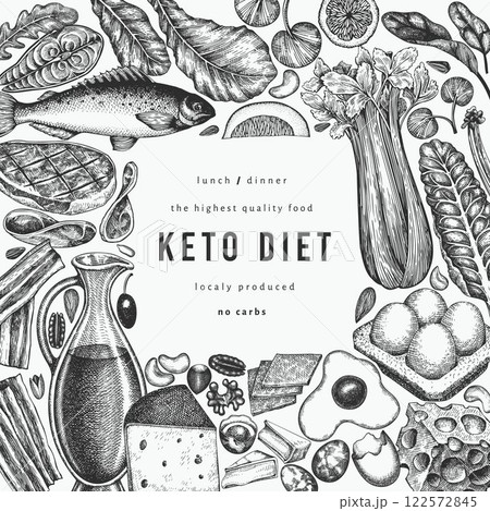 Keto Diet Design Template. Vector Hand Drawn Healthy Food Banner. Vintage Style Ketogenic Menu Illustration.