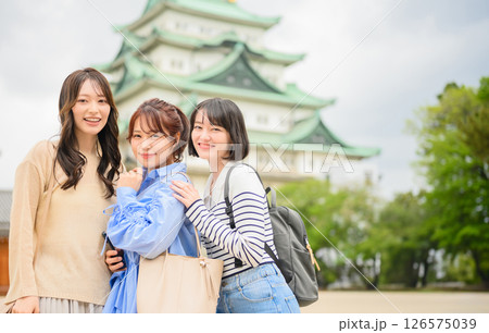 女子旅 大阪城の天守閣の前でポーズをとる女性