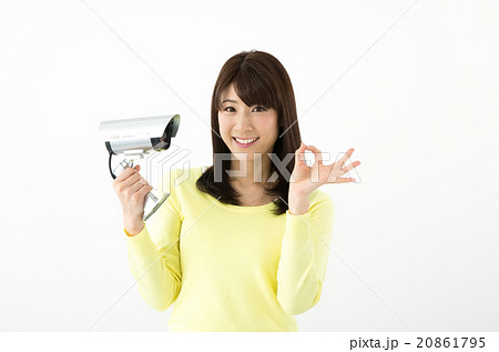 防犯カメラを手に持ちOKサインをして不動産物件を説明する女性