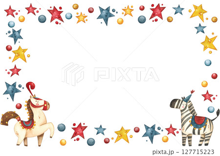 Rectangular frame with circus horse and zebra surrounded by stars and balls