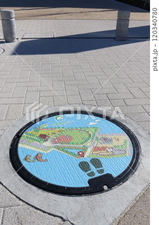 座間味島の美しいマンホール。近海に生息するザトウクジラがモチーフ。座間味島座間味港沖縄県島尻郡慶良間