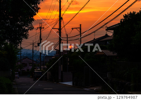 住宅街の夕焼け 空を夕焼け色に染めながら遠景の生駒山系に沈んで行く真っ赤な夕日②