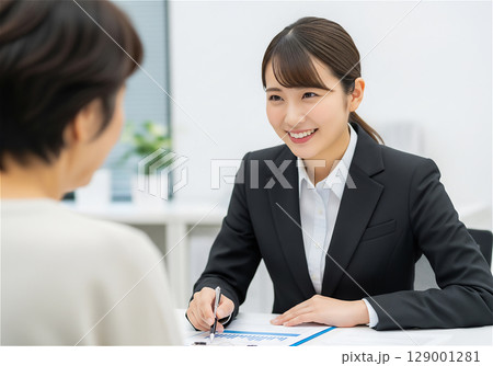 「笑顔で接客する女性営業職|保険相談・商品提案に最適なビジネスシーン」