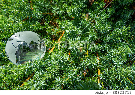 ガラスの地球儀と緑(針葉樹の葉) SDGs 環境保護のイメージ