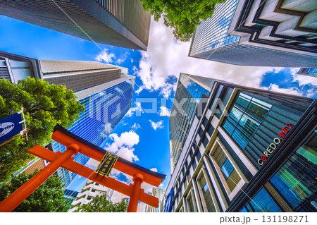 日本の東京都市景観 日本橋室町・ビルの谷間の福徳神社などを望む。右奥に再開発のビル…