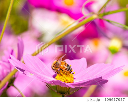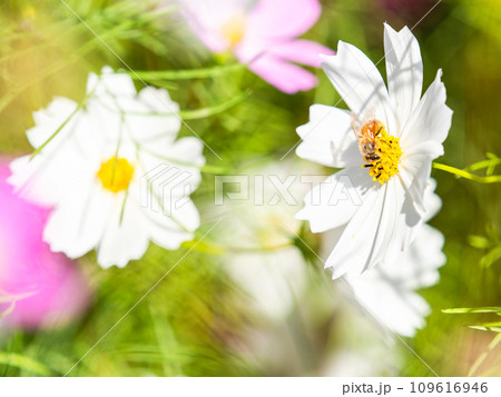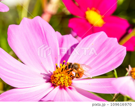 秋の景色 可憐でかわいいカラフルなコスモスの蜜を吸うミツバチ