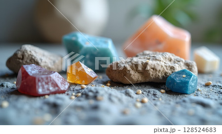 Aesthetic still life showcasing colorful gemstone formations alongside natural rocks set against a neutral backdrop creating artistic composition