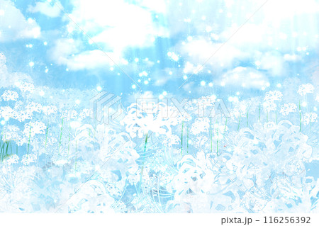 白い彼岸花、曼殊沙華の花と青い空と光のカード