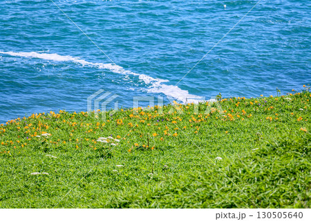 【北海道_厚岸郡_霧多布岬】切り立つ断崖と岩礁に咲き乱れるエゾカンゾウ