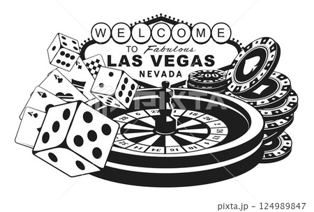 Las Vegas Sign and Casino Elements. Cards, Chips, and Roulette Wheel Composition in a vector illustration..