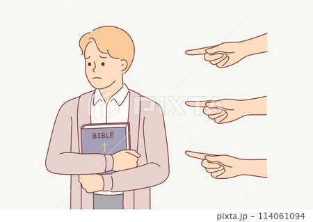 Sad christian man with bible, feeling persecution and oppression, from people pointing fingers