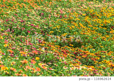 秋のお花寄せ植え畑に咲き乱れるヒャクニチソウの花「くじゅう花公園」大分県竹田市