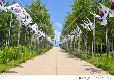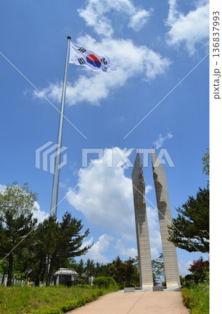 韓国 江原特別自治道鉄原郡にある白馬高地に太極旗が翻る風景