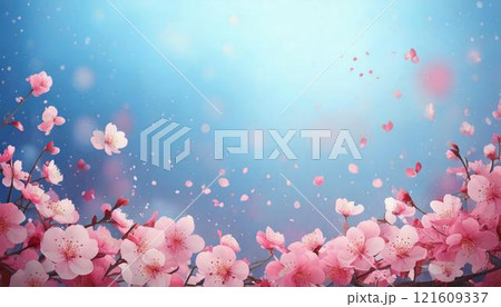 淡い青色ぼかし背景に花びらが舞い散る美しい桜の花のフレーム 水彩画風イラスト