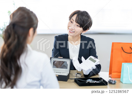 中古品の査定をする買取業者と主婦 顔無し
