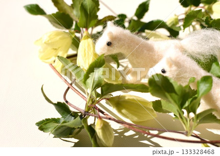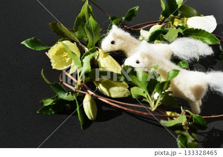 羊毛フェルトの白馬と冬咲きクレマチスの年賀素材