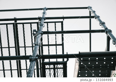 日本の横浜都市景観 マンションの補修や点検等、足場や防護ネット、ハロなどを望む。衛星アンテナが…