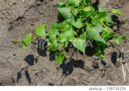 Field bindweed plant growing in dry soil showcasing its green leaves and sprawling vines under bright sunlight in a rural landscape