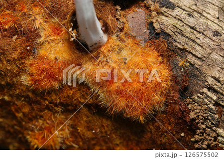 コキララタケの美しいオレンジ色の綿毛のようなオゾニウム菌糸マット(ストロボマクロ撮影)