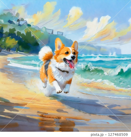 海辺を走るコーギー|元気いっぱいの絵画風イラスト(AI生成)