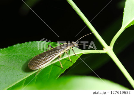 葉にキベリトウゴウカワゲラ成虫(トウゴウカワゲラ・自然環境下昆虫類ストロボマクロ撮影)