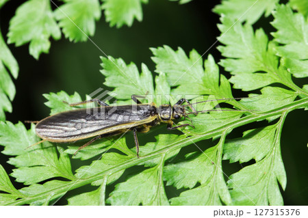 シダの葉にキベリトウゴウカワゲラ成虫(トウゴウカワゲラ・自然環境下昆虫類ストロボマクロ撮影)