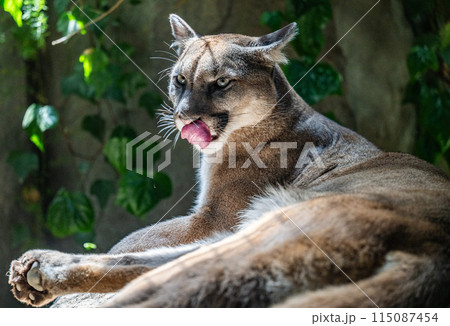 気持ちよさそうにまどろむクーガー(ピューマ)の顔のアップの風景
