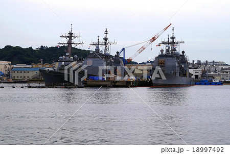 米軍横須賀基地で改修中の空母ロナルド・レーガンとタイコンデロガ級イージス巡洋艦