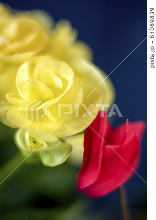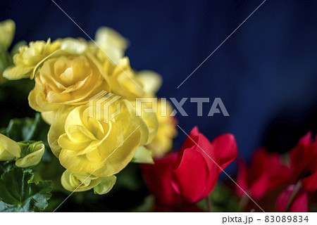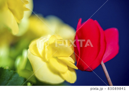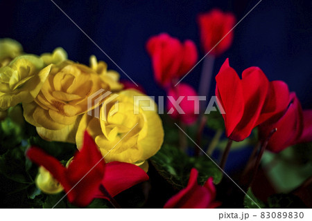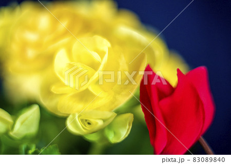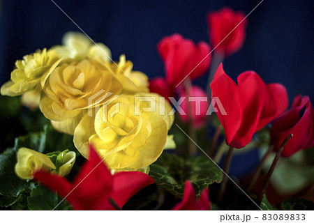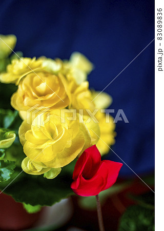 返り咲きの赤いシクラメンと黄色いベゴニア クラッシックレンズ